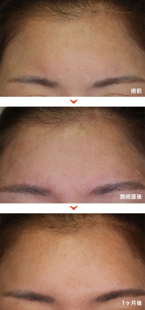 患者様は50代の女性です。額にニューラミスボリューム1mLをあきこ式(R)で注入致しました。額と眉間のボトックスも併用しております。眉上の段差がなくなりキレイなおでこになっています。