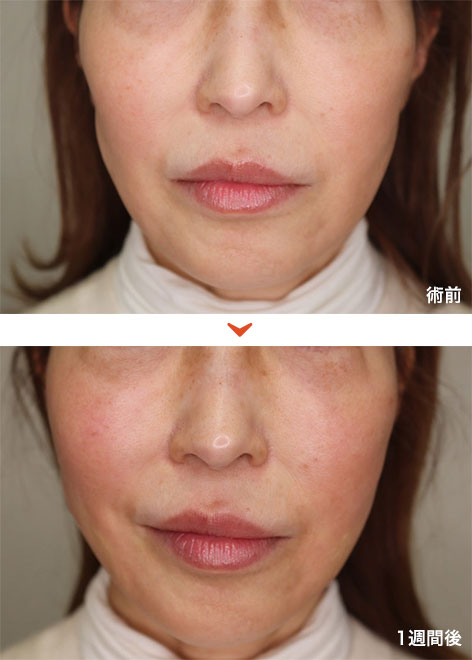 患者様は60代の女性です。サミヤンの60mmの糸を4本、100mmの糸を2本使用して口元をスッキリとさせて、こめかみには25Gのカニューレを用いて浅側頭筋膜下にレスチレンディファインを1本注入致しました。