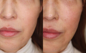 患者様は50代の女性です。そんなに口角は下がっていませんが、しっかり上げたいとのことでしたので、定番の耳珠方向よりも角度を付けて7mm切りました。傷跡の赤味はあと2か月くらいで目立たなくなります。