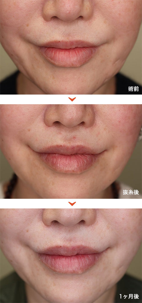 ダウンタイム:抜糸まで1週間糸が付いた状態で、術後2週間くらいは腫れと内出血・口角炎のような赤味が目立ちます。(抜糸翌日からはメイク可能)この赤味が目立たなくなるのに3〜6ヶ月かかる場合もあります。