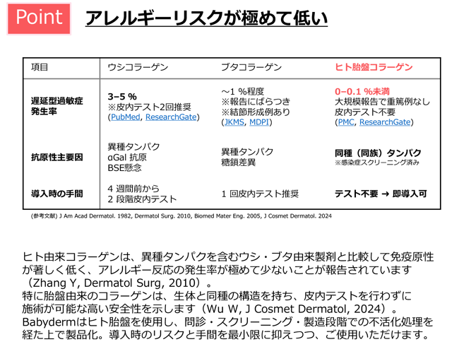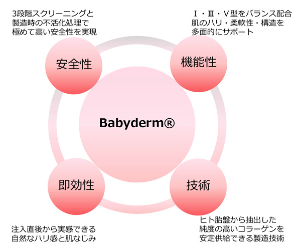 あきこクリニックで採用しているBabyderm®(ベビーダーム)は、I型・III型・V型コラーゲンをバランスよく配合。肌のハリ・柔軟性・構造を多面的にサポートします。ヒト胎盤由来のためアレルギー発症リスクが低く、パッチテストも必要ありません。局所麻酔(リドカイン)が含有されているので痛みが少ないのも特徴のひとつです。